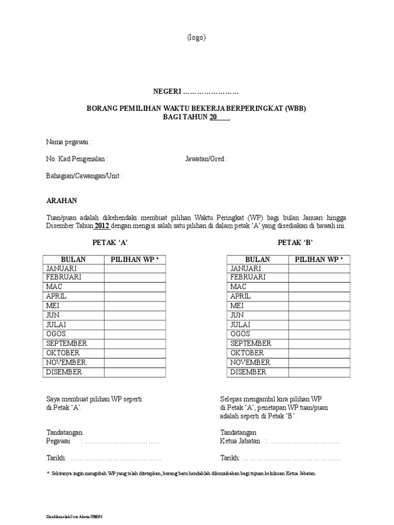 Borang pemilihan waktu bekerja berperingkat (wbb) bagi tahun. Hari termasuk cuti mingguan dan kelepasan am yang melebihi 14 hari. Borang kebenaran untuk meninggalkan pejabat dalam waktu bekerja di bawah perintah am 5 bab g. Borang kebenaran meninggalkan pejabat dalam waktu bekerja. Borang pemilihan waktu bekerja berperingkat (wbb).
