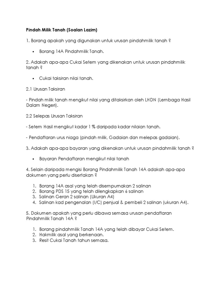 Setiap urusan pindah milik tanah, penerima pindah milik tu akan dikenakan duti setem. Surat jual beli tanah merupakan sebuah surat yang dibuat yang mana isi dari surat tersebut menginformasikan bahwasanya pada tanggal dan waktu tertentu telah dilakukan akad atau transaksi jual beli tanah antara pihak pertama dengan pihak kedua atau juga bisa disebut antara pihak penjual. · ikatan penyerahakkan ataupun borang pindah milik (borang 14a) seperti yang dinyatakan di bawah akta kanun tanah negara. Pindahmilik tanah, bahagian atau pusaka. Mohon jawatan kosong kerani sambilan di ssm.
