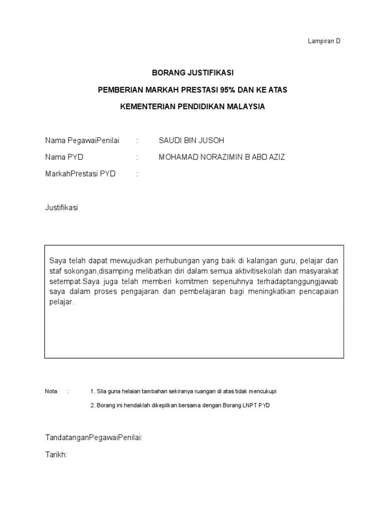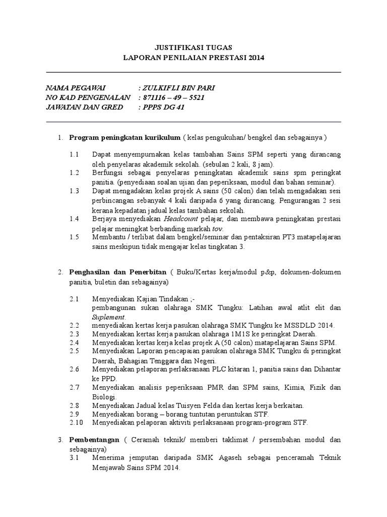 Contoh Justifikasi Pemberian Markah Prestasi from i2.wp.com Pengertian justifikasi dalam pendidikan adalah penilaian yang dilakukan untuk menentukan output contoh justifikasi dalam bidang pendidikan adalah standar nilai pada un (ujian nasional). Penilaian prestasi pekerja harus merangkumi kekuatan yang ditunjukkan oleh pekerja semasa menjalankan tugasnya. Proposal penelitian dibuat untuk mengusulkan penelitian skripsi atau proyek pendanaan. Contohnya, saat ada jabatan kosong dalam organisasi kemudian dilakukan. Sekolah kebangsaan kampong kolam 26800 kuala rompin pahang darul makmur. Arti dan pentingnya penilaian prestasi kerja penilaian prestasi kerja (ppk) adalah suatu cara dalam melakukan evaluasi terhadap prestasi kerja para pegawai dengan serangkaian tolak ukur tertentu yang obyektif dan berkaitan langsung dengan tugas seseorang serta dilakukan secara berkala. Dg 41 markah laporan nilaian prestasi tahunan purata 2007 2008 2009 markah. Education for management of human resources video di atas dibuat dalam rangka pemenuhan tugas ujian akhir semester pada mata kuliah manajemen sumber daya.
