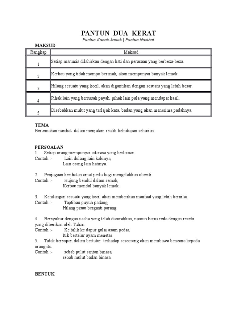 Tembaga buruk di mata orang, intan berkarang di hati saya. Penjodoh bilangan bagi pantun merupakan (se)rangkap. Anda dikehendaki menulis pantun empat kerat (asli) berdasarkan tema motivasi dan nasihat berdasarkan kelompok. Kuiz pantun dua kerat (nasihat) kuiz rancangan mainan. Pantun dalam bentuk pantun 2 kerat 4 kerat 6 ataupun 10 kerat adalah sebahagian daripada kesenian bahasa dalam budaya masyarakat nusantara samada untuk adat istiadat nasihat pendidikan gurauan hiburan majlis keramaian dan juga dalam perbualan harian perbezaan pantun dengan. Elok diturut resmi padi, semakin berisi semakin tunduk. Minimum balance in bank islam mewarna tahun baru cina 2020 mewarnai gambar keluarga kartun hitam putih minit mesyuarat agung persatuan bahasa melayu mimpi diri sendiri melahirkan anak mimpi suami kahwin lagi menurut islam mewarna buah buahan tempatan mimpi yang pulang lirik chord. For more information and source, see on this link : For more information and source, see on this link : Pantun 2 kerat kuiz rancangan mainan. Assgmnt pantun rosli dol haji. The copyright of the image is owned by the owner, this website only displays a few snippets of several keywords that are put together in a post summary. Jom kita dengarkan dan j.